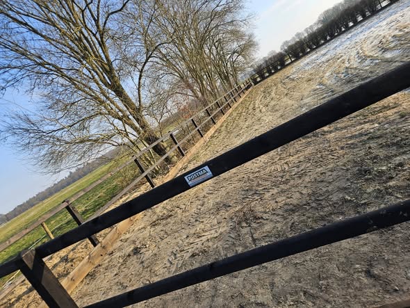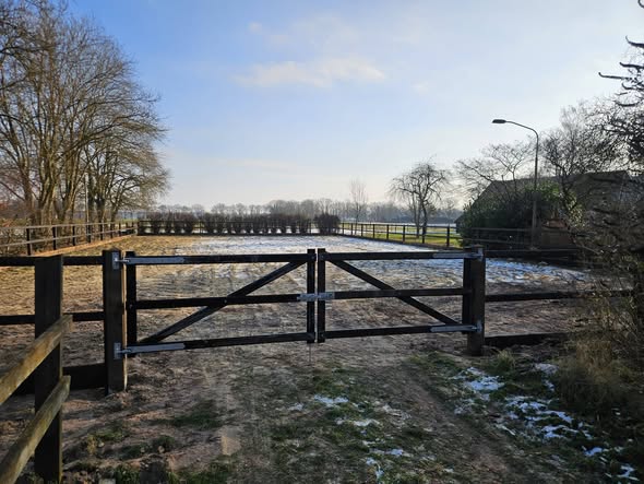 Het betreft een houten omheining met vierkante palen en diamantkop, wat zorgt voor een luxe uitstraling. Daarnaast zijn Engelse poorten geïnstalleerd, voorzien van zwaar verstelbaar hang- en sluitwerk. De omheining is perfect geschikt als paardenomheining en voor een rijbak. Alles is Nobifix behandeld in een warme bruine kleur, wat zowel duurzaamheid als stijl garandeert.